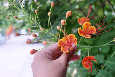 Hand Holding Bunch of Fresh Red Caesalpinia Oulcherrima, Dwarf Poinciana, Flame Boyant, Mexican Bird of Paradise, Royal Poinciana or Peacock Flowers on Tree Brance.