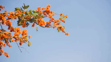 A branch bearing vibrant orange flowers is set against a serene, clear blue background. The image showcases natural elements with a focus on color and texture. Its composition and lighting suggest outdoor conditions, ideal for commercial uses promoting nature or botanical themes.