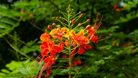 Colorful of Caesalpinia pulcherrima, Peacock flower. Red peacock flowers tree on natural green background.
