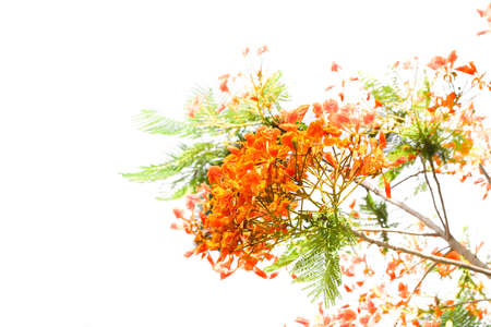 Orange flowers and buds of The flame tree or Royal poinciana are on brushes and white sky background.