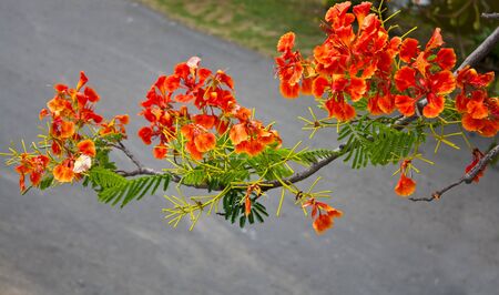 Exquisite orange flamboyant flower blossom against blurred background in natural setting