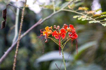 Radiant Peacock Flowers Blooming on a Branch, Vivid Colors Displayed