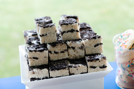 A colorful display of layered cookie dessert squares captures attention at an outdoor gathering on a sunny day.