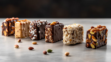 Enjoy a visually appealing display of nutty snack bars featuring pine nuts and dried fruits, perfect for health-conscious consumers and culinary enthusiasts.