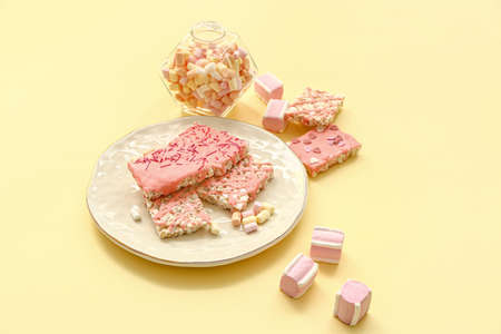 Puffed rice bars (kozinaki) on yellow background, flat lay