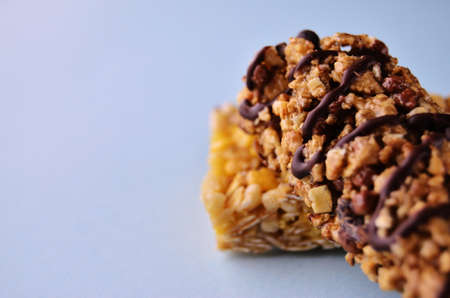 Crispy homemade granola bar cube, puffed rice and honey, placed on a solid blue background