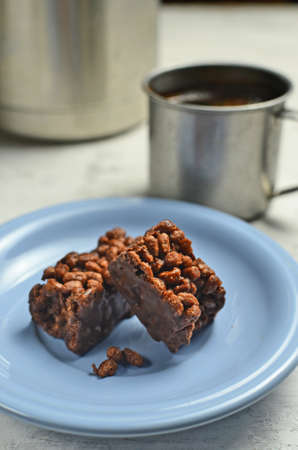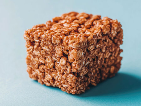 Crispy homemade granola bar cube, puffed rice and honey, placed on a solid blue background