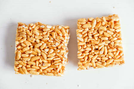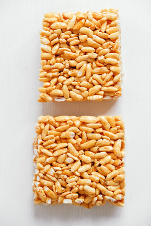 Puffed rice bars (kozinaki) on yellow background, flat lay