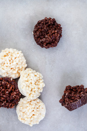 puffed and crisp rice treats with milk chocolate and white chocolate made in tart tin on mottled grey