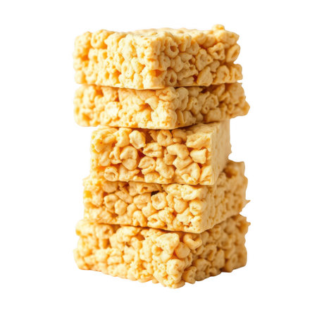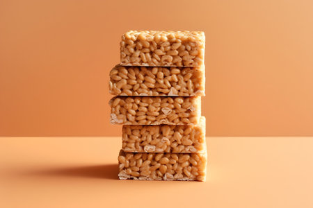 A close-up, eye-level shot showcases a neat stack of five golden-brown cereal bars. The texture is visibly crunchy with embedded colorful bits, suggesting a delightful sweet treat. These bars are perfect for a quick snack.