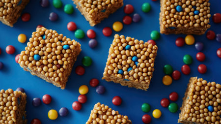 A delightful arrangement of colorful snack treats and vibrant candies set against a bright blue surface, perfect for parties or celebrations.