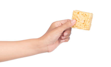 hand holding puffed rice isolated on a white background