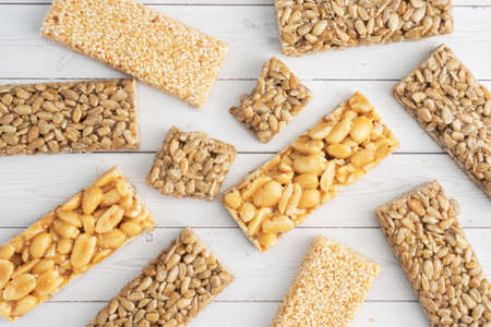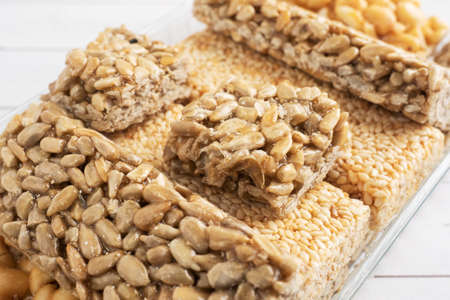 Oriental sweetness of brittle, Kozinaki in sugar glazed peanuts, sunflower seeds and sesame seeds,