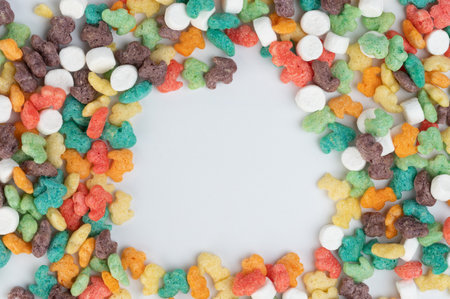 Colorful cornflakes with marshmallow frame on white studio background