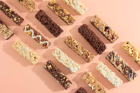 Various Healthy Cereal Granola Energy Protein Bar on Salem Background, Top View