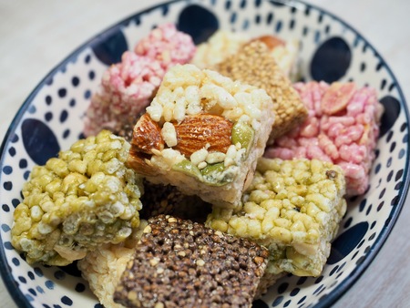 Rice krispie treats bites with marshmallow, small snack for kids