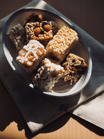 Amaranth and peanut desserts on wooden table with red kitchen tablecloth