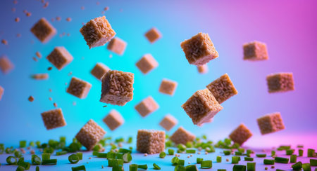 A vibrant food photo of flying tofu cubes and green onions, with a cool blue and pink gradient background. Modern, abstract, and visually appealing.