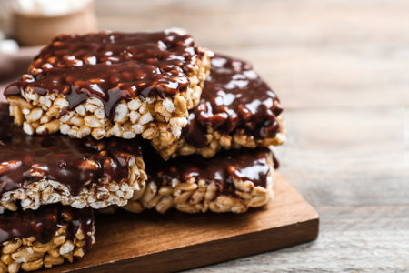 Board with crispy rice bars on table
