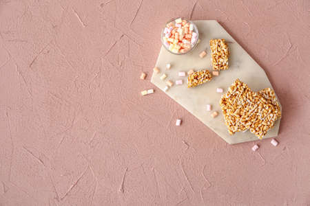 Board with crispy rice bars and marshmallow on color background