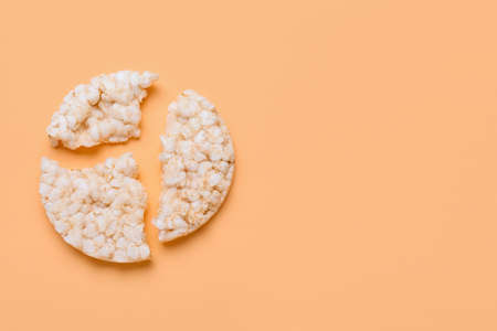 Broken rice cake on a pink background with copy space. View from above.