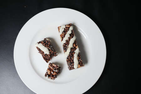 Three granola bars on a black background. Proper nutrition. Selective shot.