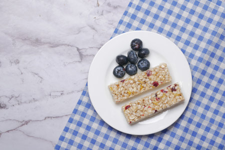 Crunchy muesli cookies and blueberries, Breakfast cereals isolated on white background, selective focus, top view.