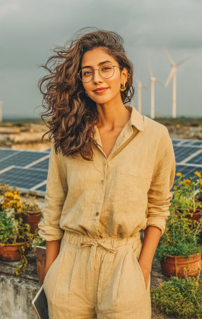 Young woman standing on rooftop with solar panels and wind turbines, promoting sustainability