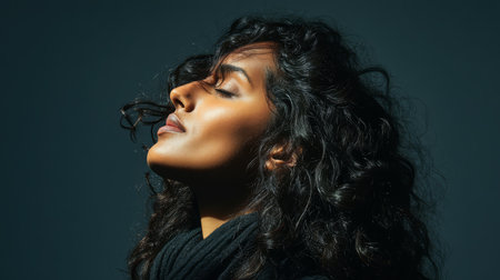 A woman with beautiful curly hair stands in soft light tilting her head back with her eyes closed. She expresses a sense of calm and tranquility embodying natural beauty and peacefulness.