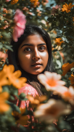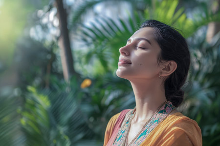 Indian woman enjoying fresh air with closed eyes in a tropical garden, feeling relaxed and peaceful