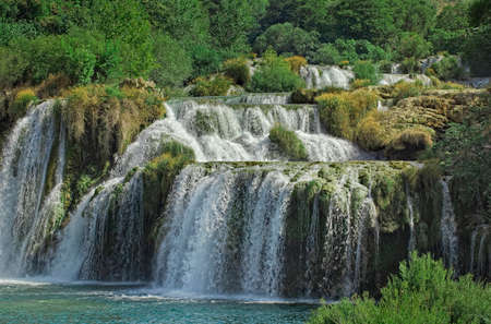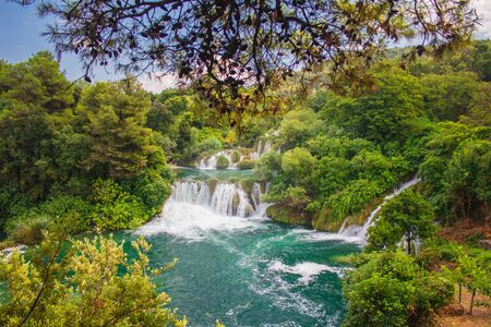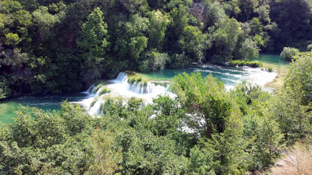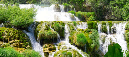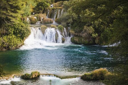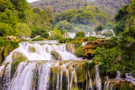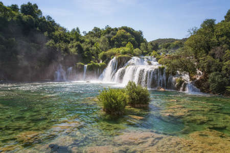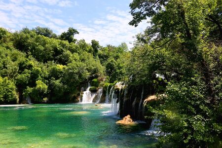 Waterfalls at Skradinski Buk, national nature park Krka, Croatia. Flowing water in beautiful nature, green plants and trees. Sunny summer day.