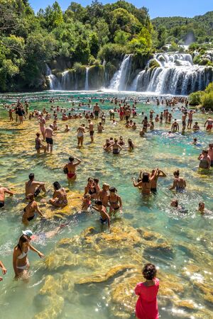 KRKA NATIONAL PARK, CROATIA - AUG 19, 2019: People swim in Krka River over Skradinski Buk in Croatia, Waterfall in Krka National Park