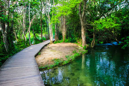 Wooden pathway trough the dense forest near Krka national park waterfalls, Croatia