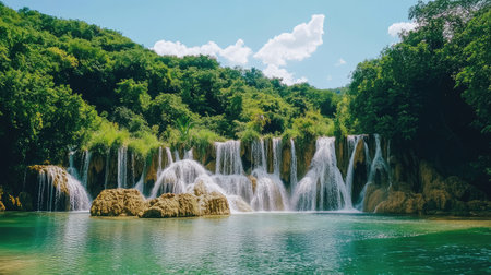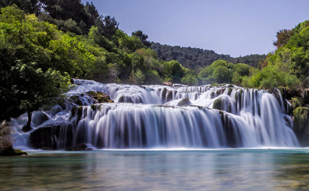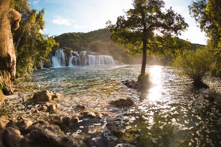 Breathtaking view Waterfalls of Krka National Park, Sunny day, summer season having greenery and trees, Croatia