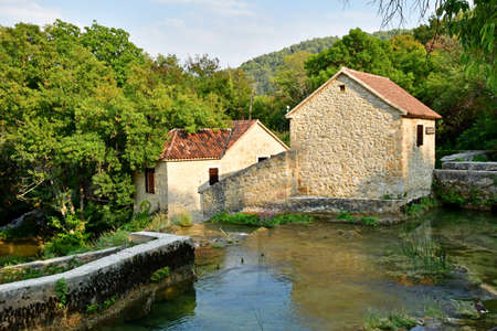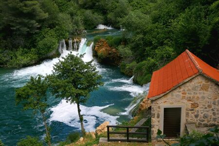 Old traditional watermill on river Krka in National Park Krka, Croatia. Beautiful watrefalls in the background. Krka is popular summer travel destination.
