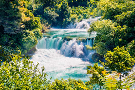 Captivating summer view of Skradinski Buk waterfall. Impressive morning scene of Krka National Park, Lozovac village location, Croatia, Europe. Beautiful world of Mediterranean countries.