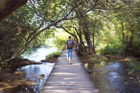 A man with a backpack goes on a wooden bridge. National Park in Croatia. Picturesque places of Europe. A walk through the woods.