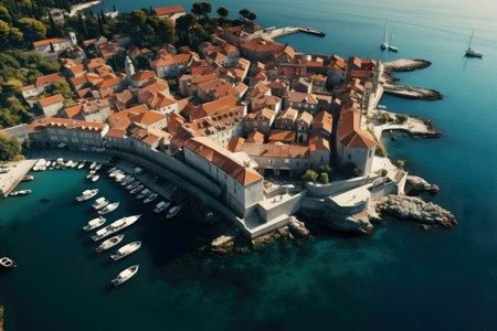 Stunning aerial shot of a beautiful coastal town. Red rooftops, clear waters.