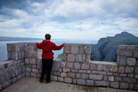 Female traveler make a panoramic photo of the old city of Dubrovnik from the mountain, Croatia.