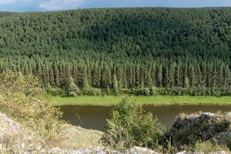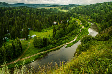 Rocks and the Mana River, the nature of the Siberian taiga. Breathtaking view from a cliff overlooking a winding river and lush green forests during the golden hour in a remote landscape