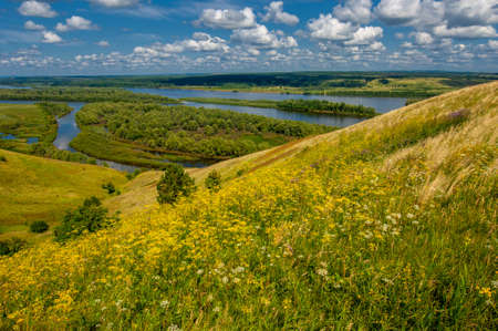 Landscape of the river bank in Siberia. bright juicy colors hilly riverbank and blue clouds