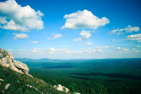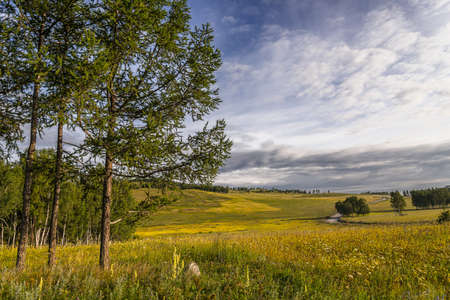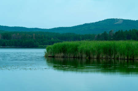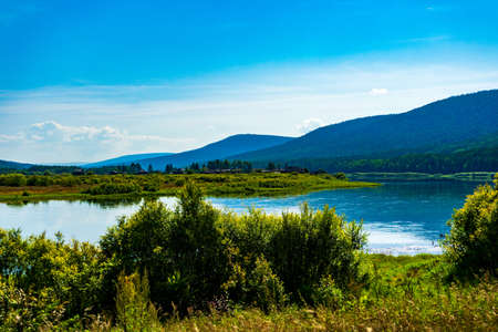 Beautiful landscape with a mountain range on a blue sky with white clouds on the forest meadows and lake in summer Russia, Chelyabinsk region, Zyuratkul Range