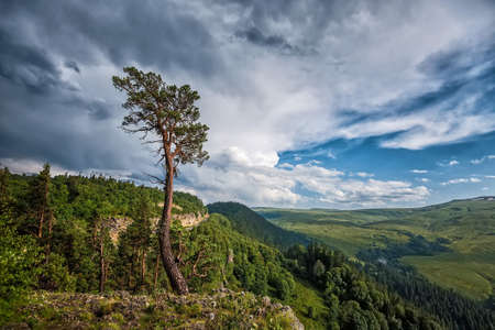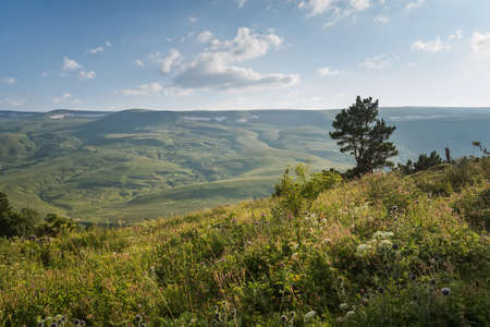 Beautiful landscape with lonely tree and subalpine mountain meadow and forest in Caucasus, Russia