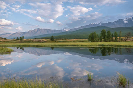 Amazing summer landscape with beautiful clouds in the blue sky, mountains covered with snow and forest, larch trees, a lake and reflections in the water. Altai, Russia