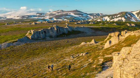 Kamchatka, Russia - July 9, 2018: Hikers climbing to the mountain.