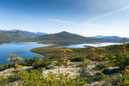 Russia. Magadan Region. A beautiful forest lake against the backdrop of the Big Anngachak mountain range. Autumn in the vicinity of Lake Jack London.