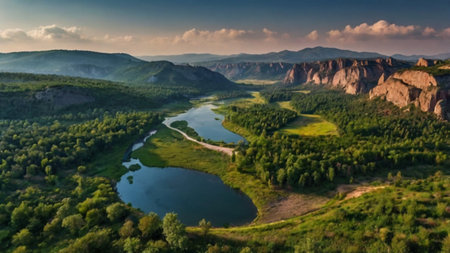 Beautiful green mountain scenery with lake system on tableland among forest hills. Scenic landscape with lakes group on plateau. Blue lakes system and channels in wide valley. System of mountain lakes