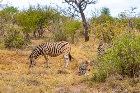Beautiful striped mother and child baby zebra in the nature on safari in Kruger National Park in South Africa.