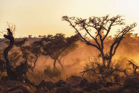 South Africa. The famous Kruger Park. Animals live and move freely in the African savannah. Narrow dirt road. The concept of active, exotic, ecological and photo tourism