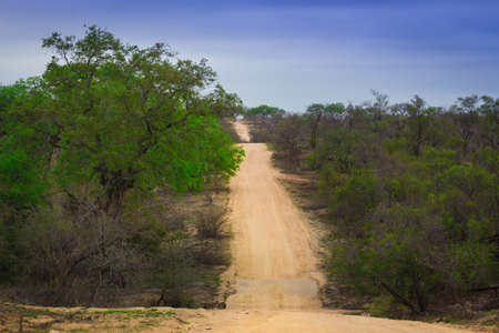 Gravel road through bushveld savanna in Kruger national park South Africa
